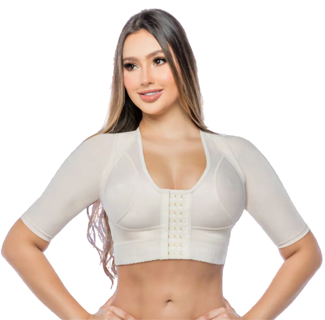 Este brasier posquirúrgico con mangas es ideal para procesos de lipo de brazos y busto, ya que brinda la compresión y el soporte necesarios durante la recuperación. Su diseño cubre por completo la zona superior del torso y los brazos, ayudando a reducir inflamación, mejorar la circulación y favorecer un resultado más uniforme.